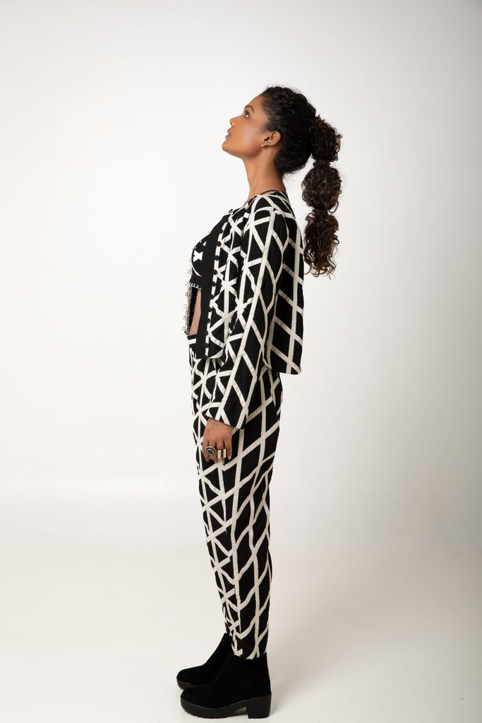 Our straight pants with geometric applique.