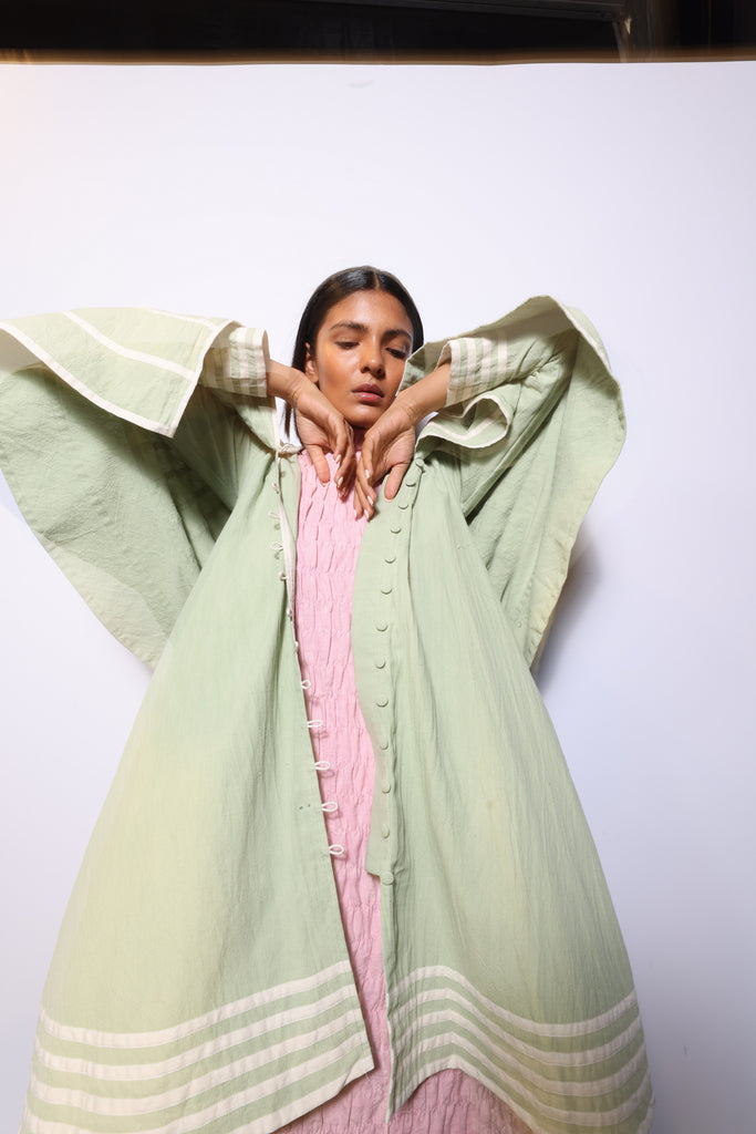 Our applique patterned jacket with a flared layer at the back.