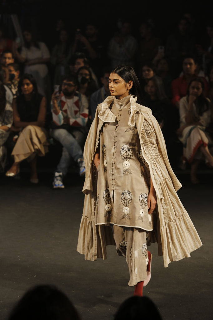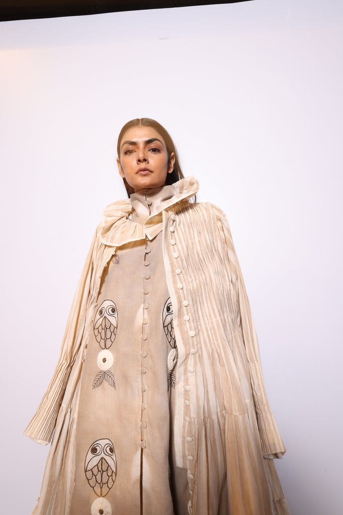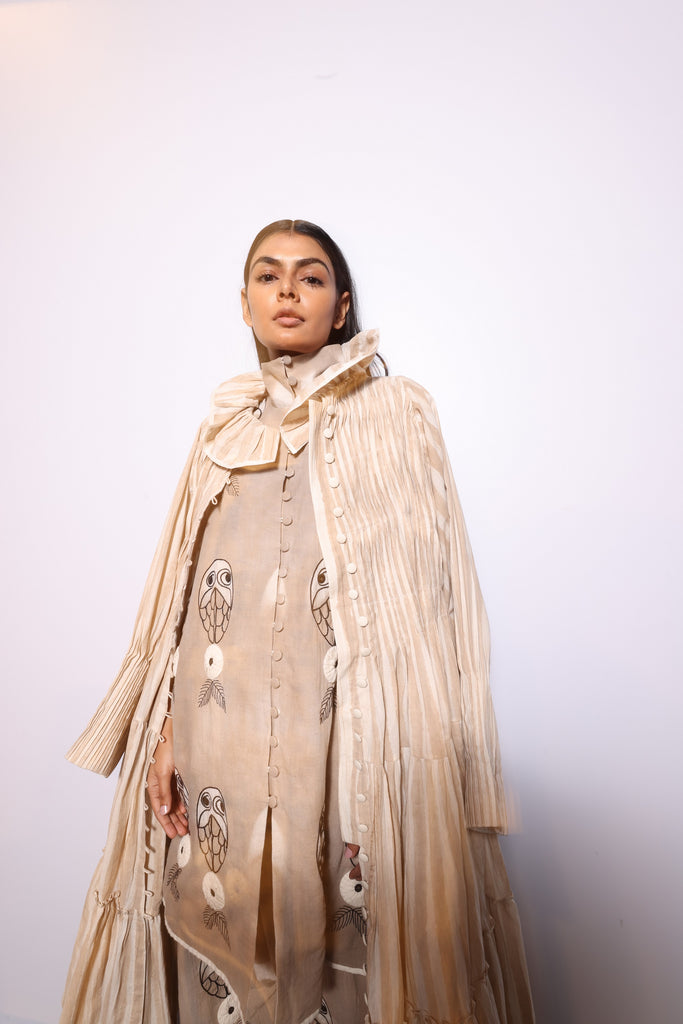 Our Mono-chrome screen printed jacket style dress with pleating and frill details.