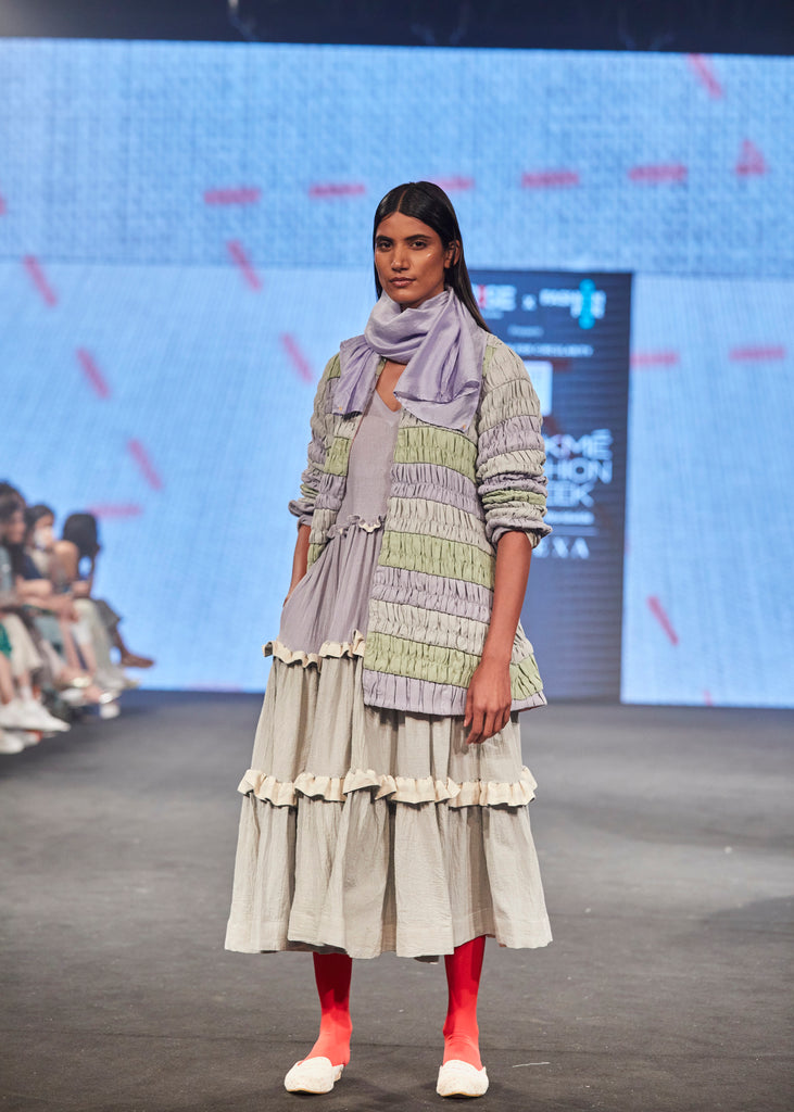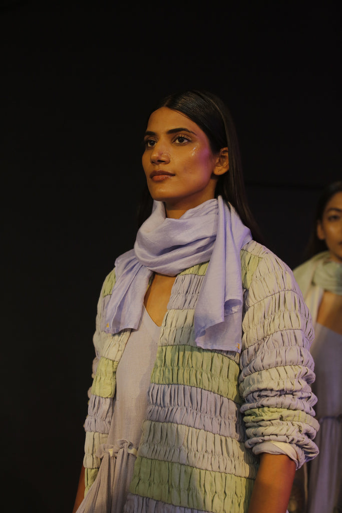 Our Bluey Scarf has been worn with our Quila Dress and Mela Jacket that can be purchased separately.