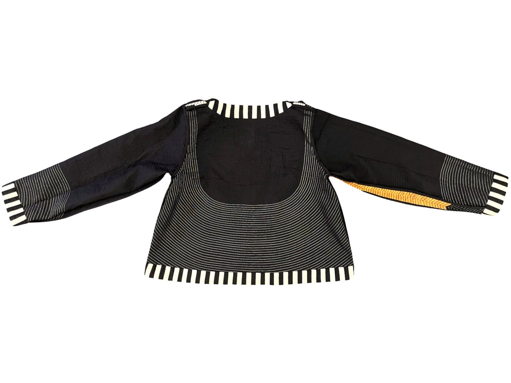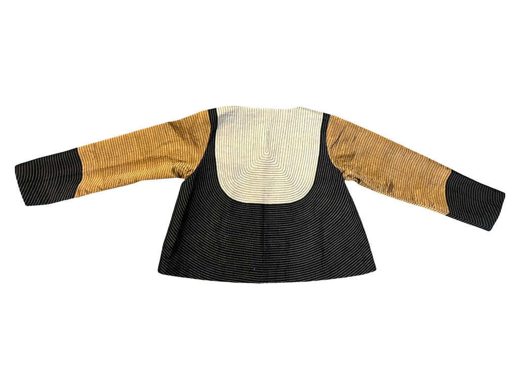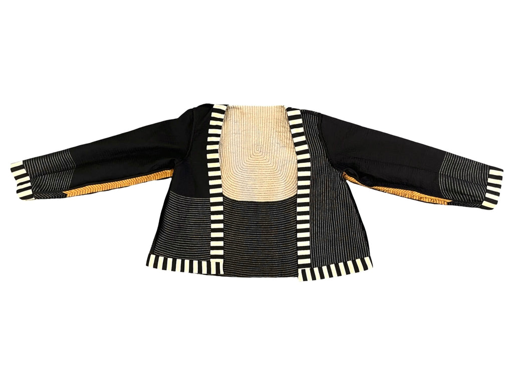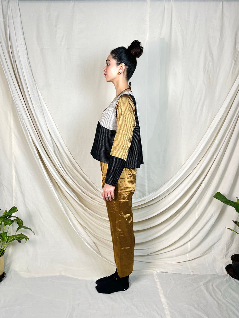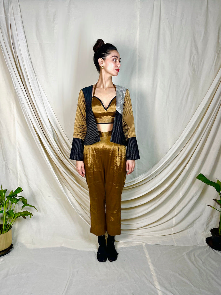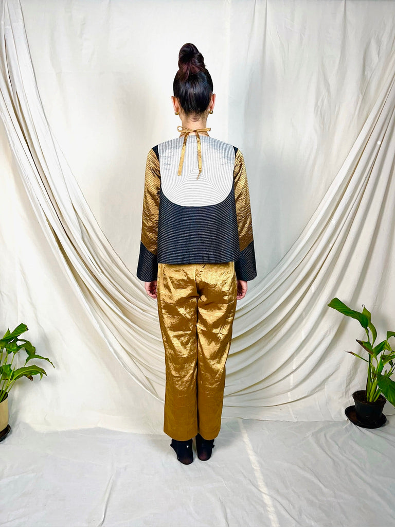 Our reversible metallic open jacket with zari stitch & appliqué facing