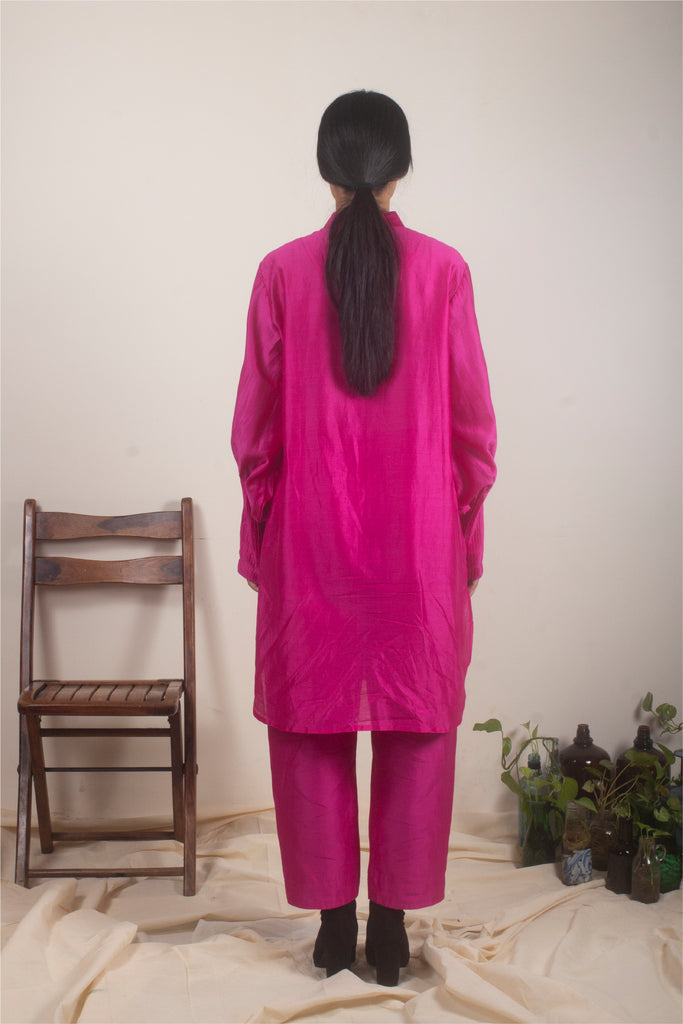 Our hand dyed shirt with a standing collar and pleated sleeves.
